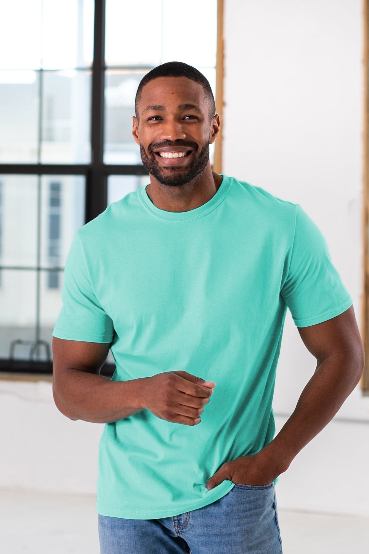 A classic one hundred percent cotton tee reimagined with better in mind. Professionalize this simple, soft t-shirt for the office or wear it with gym shorts for those casual Sunday mornings.  You can definitely wear these t shirts under blazers for a great business casual look .  These ringspun cotton t shirts are sure to become a wardrobe staple! The relaxed, breathable fit is designed for comfort and wearability. Features like the double needle topstitch at the collar and dependable hems keep this basic versatile and stylish. Looking for fair trade shirts mens or unisex?  Look no further!